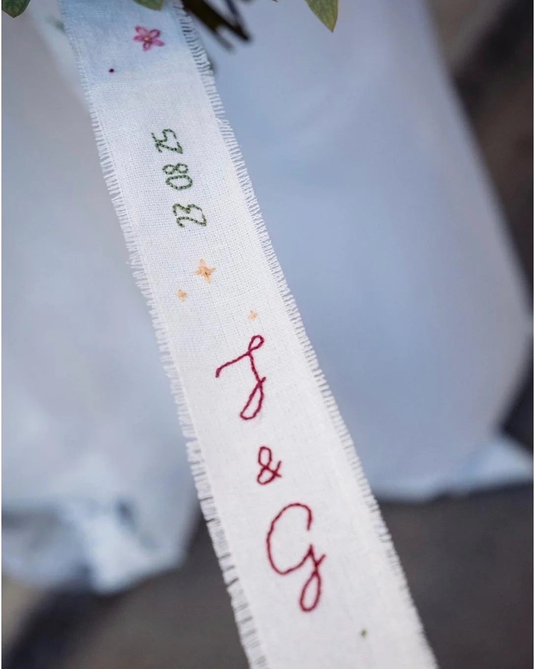 Diseñamos y bordamos cintas para ramo de novia totalmente personalizadas. Puedes elegir la frase, los nombres, la fecha o un mensaje especial que quieras llevar contigo el día de la boda.